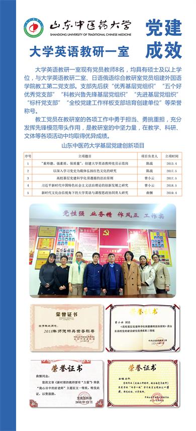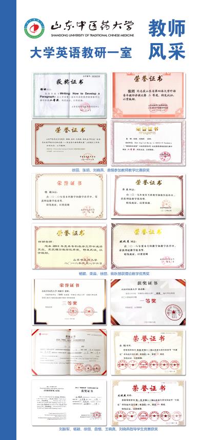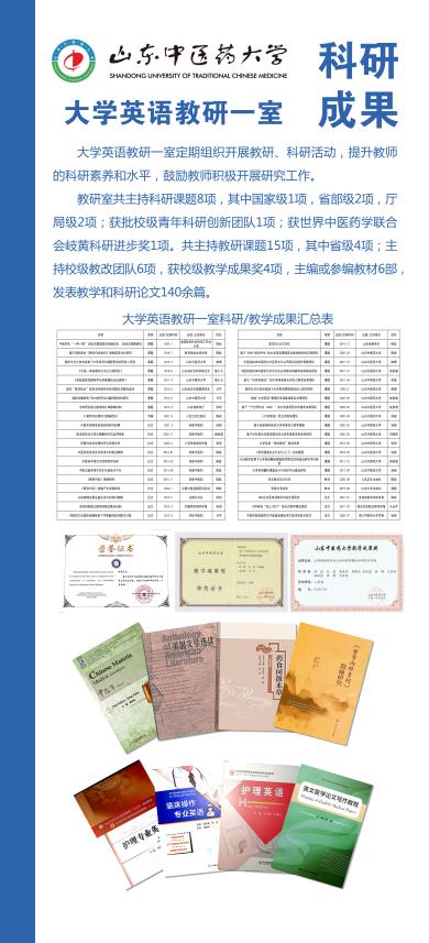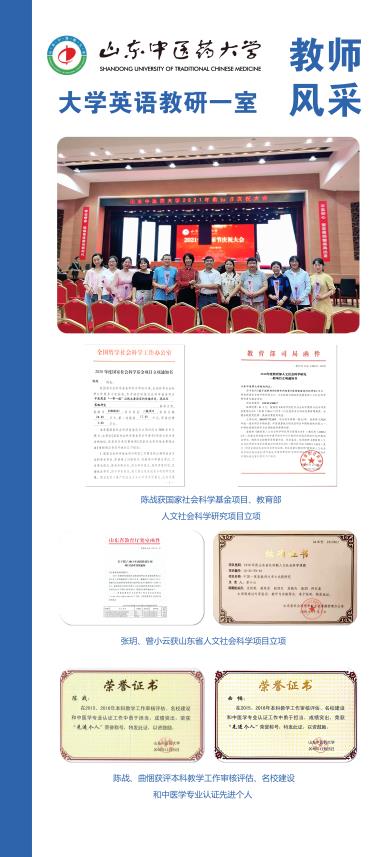 教学成果奖3项;编写教材5部,其中全国中医药行业高等教育“十三五”规划教材2部(《中医英语》和《护理专业英语》),国家卫生和计划生育委员会“十三五”规划教材1部(《中药学》)。