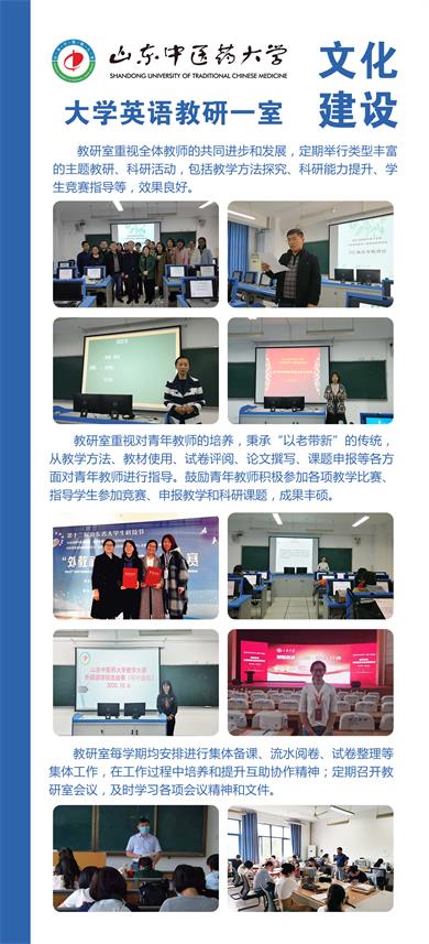 为提升学生运用英语进行专业活动和学术交流能力,教研室初步形成了“通用英语+学术英语”的大学英语课程体系,且已培养了一批具有英语和中医双重教育背景,能够从事学术英语教学的教师。教研室主要承担《大学英语I》《大学英语II》《大学英语III》,《大学英语IV》《大学英语V》《中医药英语》《博士英语》《英文医学论文写作》《英语国家社会与文化入门》《英语视听I》等课程的授课任务。每学年承担学校各专业本专科生 6000余学时的教学任务。