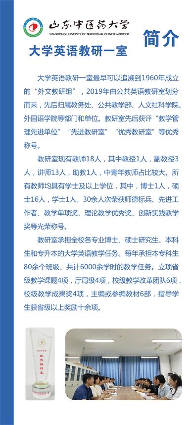 将原大学英语教研室进行重新划分,成立大学英语教研一室。2016年荣获“先进教研室”称号,2019年荣获“首届金讲台工程——优秀教研室”称号。教研室主任为陈战,教学秘书为曲悃。