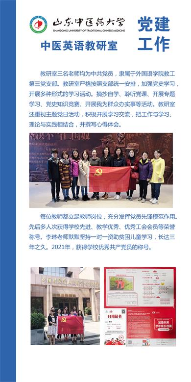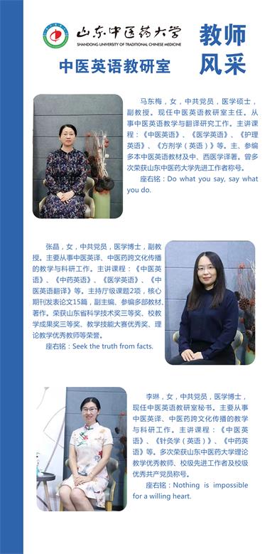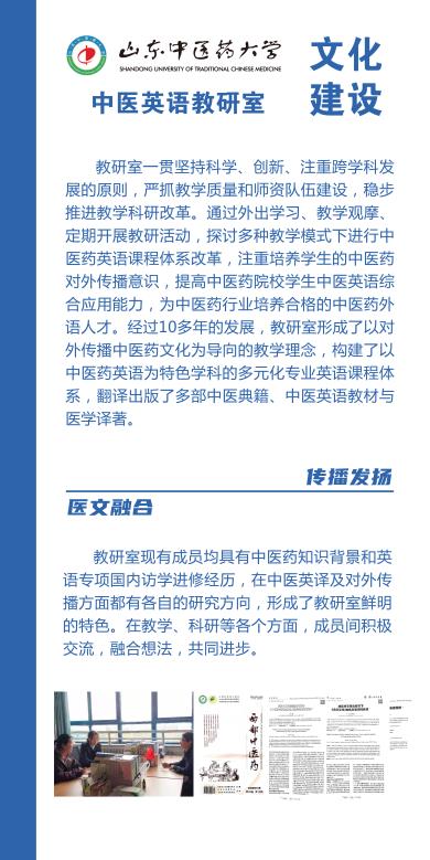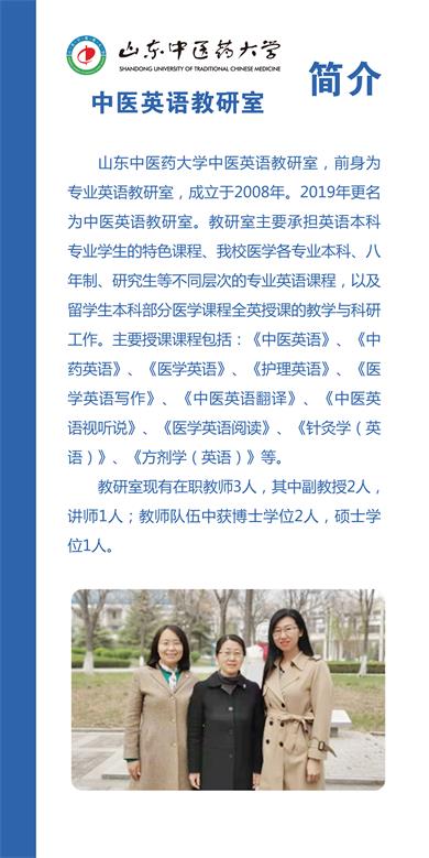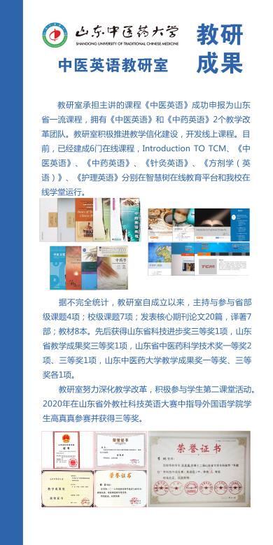 将其更名为中医英语教研室。多年来在课程建设方面,我们充分利用现有教学条件,努力提高教师的教学水平,积极开展教学研究,改进教学方法及手段,提高教学质量,使教学能够更好地适应中医药对外传播与发展的需要。