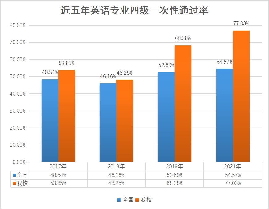 英语专业学生在2021年6月进行的全国高校英语专业四级考试(TEM-4)中表现突出,一次性通过率达77.03%,高出全国平均水平22.46个百分点。