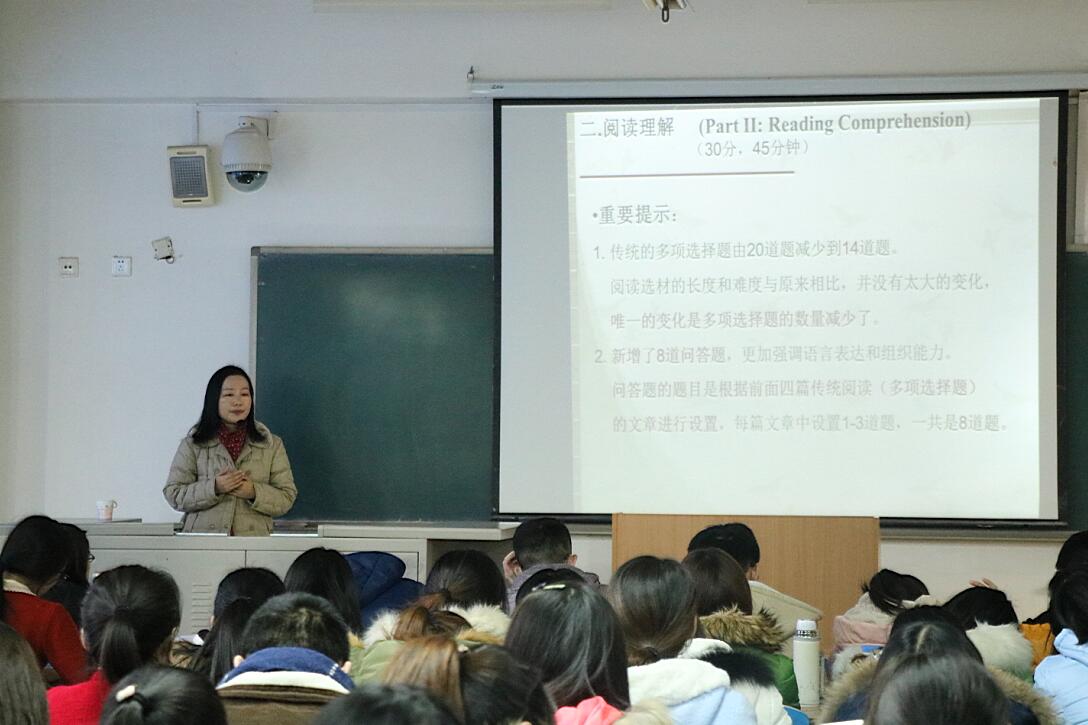 讲座中,孙慧老师强调了专四、专八对英语专业学生的重要意义,鼓励同学们要充满信心,充分利用寒假时间积极备考。针对当前同学们存在的基础知识需要巩固的问题,给予了有效的复习训练方法的指导和建议;同时提醒同学备考要充分了解试卷每部分的题型、分数及所用时间,找准提分点多进行限时训练。随后,闵玲老师、王芳芳老师分别针对专八、专四考试进行了辅导教育。闵玲老师讲解了近几年来专八题型的变化,如:考试时间有所缩减,听力、阅读以及改错题分值增加,取消对人文知识的考查等。王芳芳老师讲解了专四考试的考试要点,对每种题型进行深入的分析,指出专四考试取消新闻听力及新增讲座内容的系列变化,并提醒同学们在考试中要把握好时间。最后,老师们进行了现场答疑。
