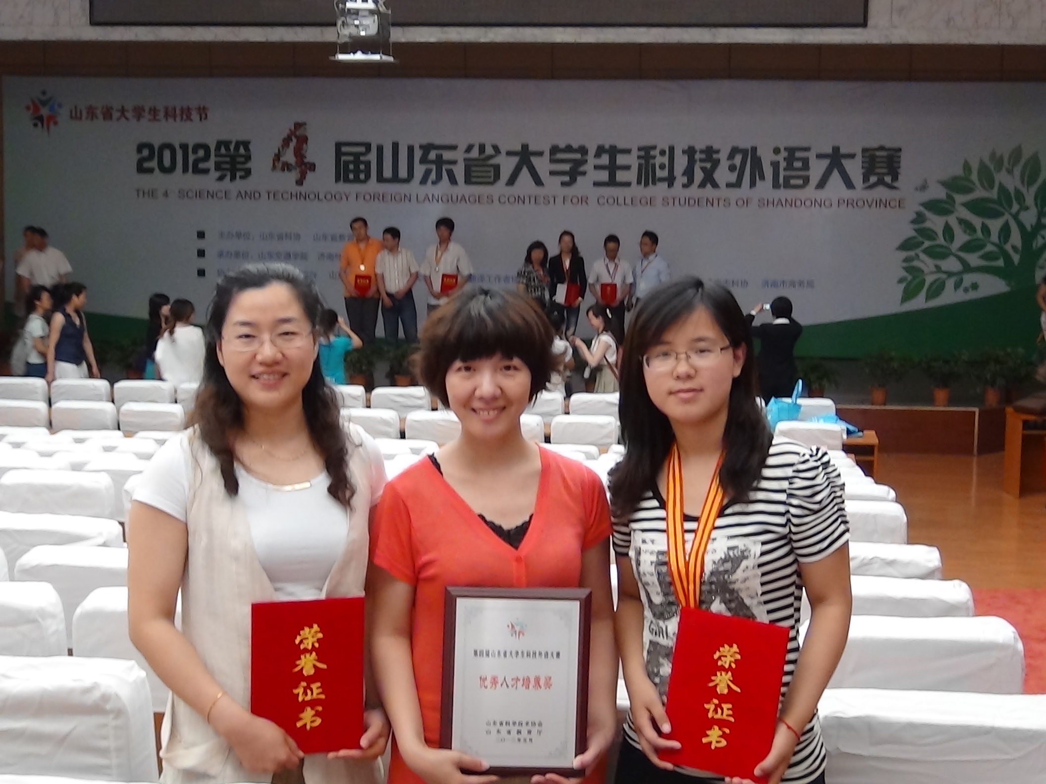 5月25日,第四届山东省大学生科技外语大赛在济南结束。来自全省70所院校的127名选手参加了英语专业组和非专业组的比赛。天美传媒 荣获优秀人才培养奖,天美传媒 英语专业2009级学生高华获大赛专业组三等奖,指导教师袁婷获优秀指导奖,领队卢甜获优秀领队奖。