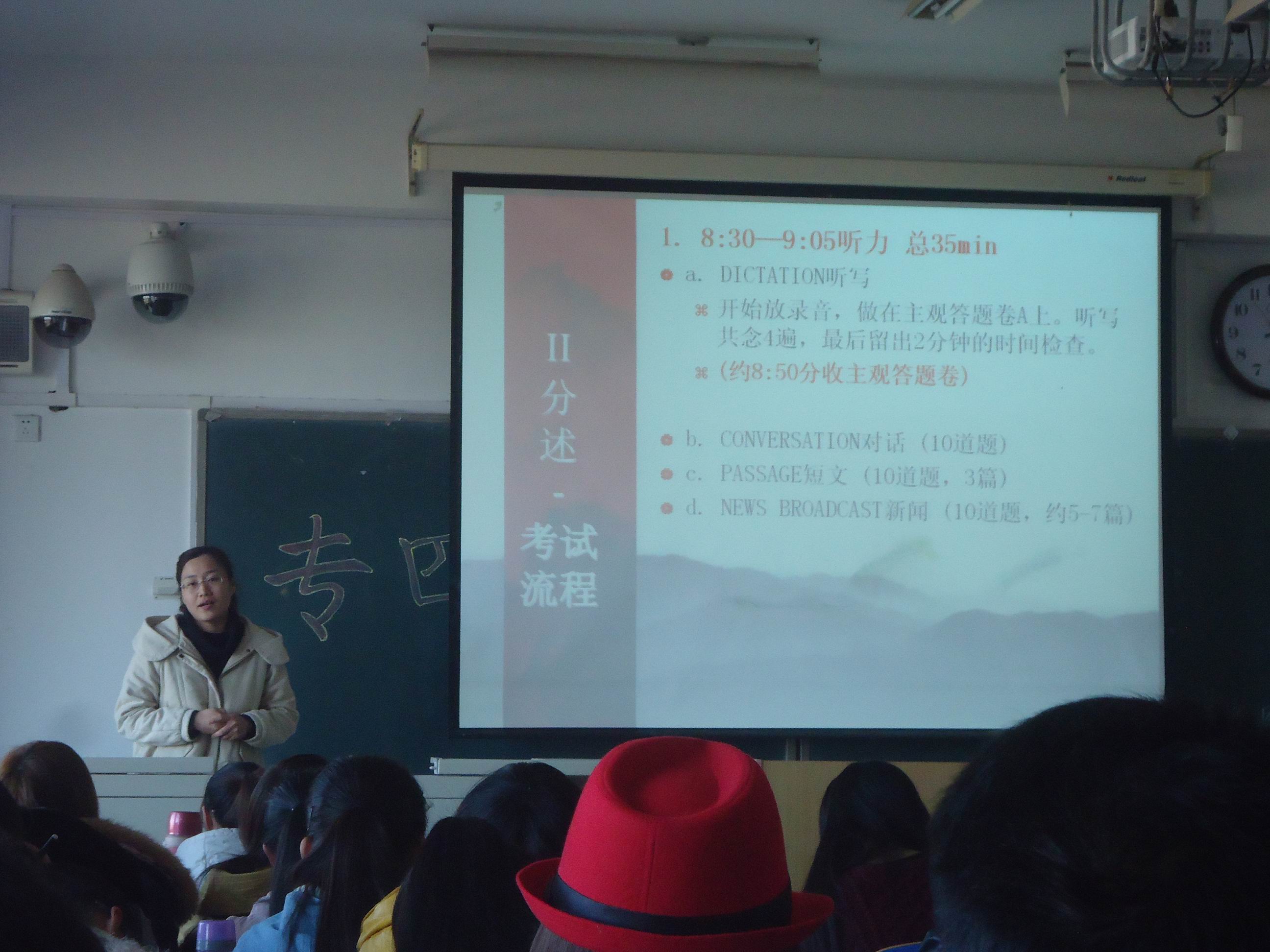 孙慧首先对本次交流会表示肯定和重视,并就专业四级考试前的备考方法进行了讲述;袁婷针对专业四级考试的时间、题型、流程、难点分析及策略进行细致的讲解;2011级优秀学生代表分享了各自的复习经验和策略。同学们积极参与,充分交流。