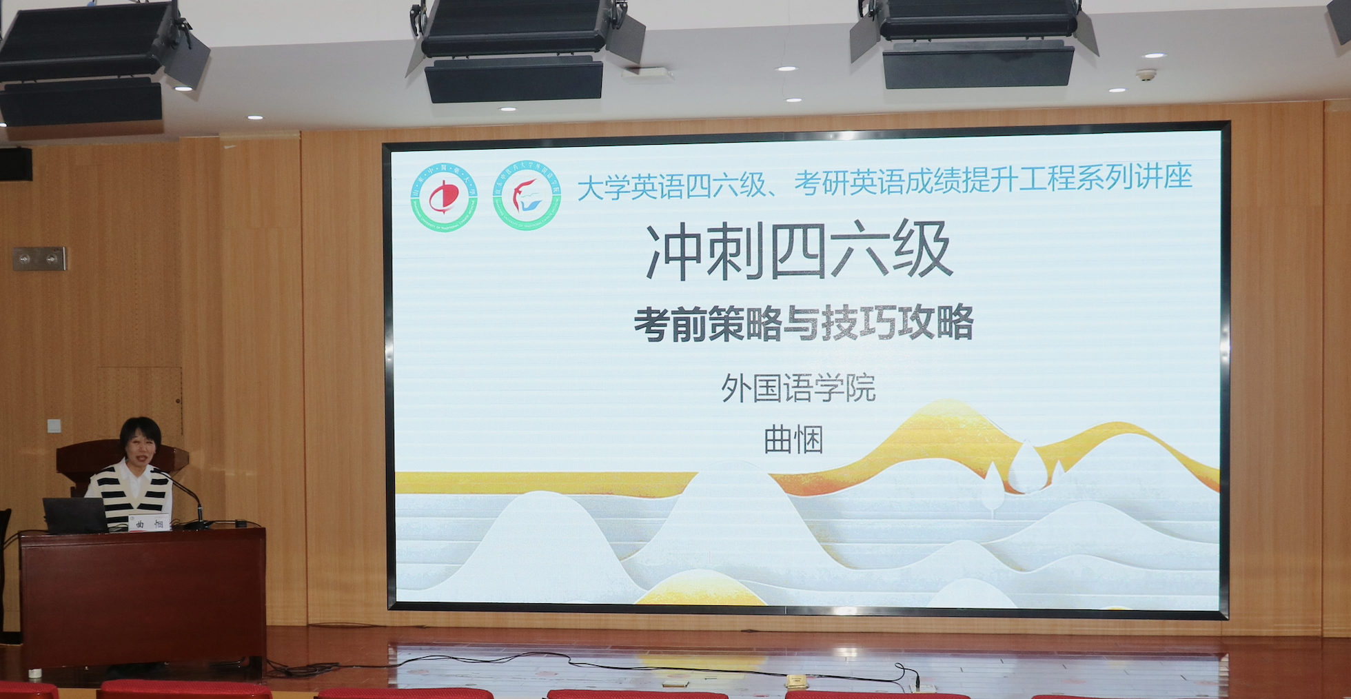 大学英语教研一室主任曲悃副教授在长清校区三号教学楼第二报告厅作《冲刺四六级:考前策略与技巧攻略》专题讲座。