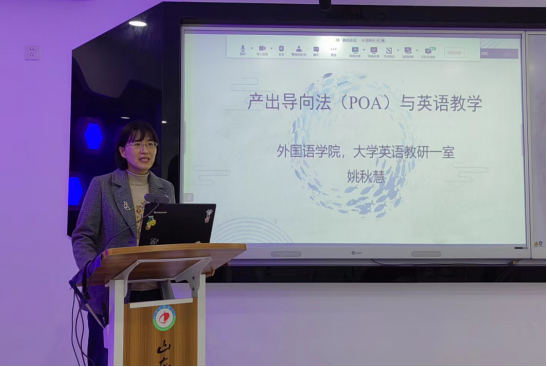 姚秋慧老师做了题为“产出导向法(POA)与英语教学”的报告。她首先介绍POA理论的产生背景和POA理论体系,然后分享自己开展POA英语教学实践及体会,并展示POA教学的课后互评方式以及优秀的产出作品。在报告中,不仅提供了详实的一线教学数据,还总结了POA教学中的许多经验技巧。