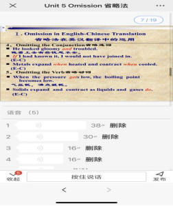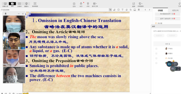 线上学习方便快捷,且资源丰富,可以大大提高教学多样性。但学习效果可能会打折扣,无法监控到学生们的学习环境与背景,无法实时关注学生课堂动态。由此,《英汉互译》课堂上,教师通过抽问学生,让学生通过语音发言回答问题,确保每位学生都实时在线学习。课堂也设有讨论区,学生可以在老师讲课过程中实时反馈,提出疑问。