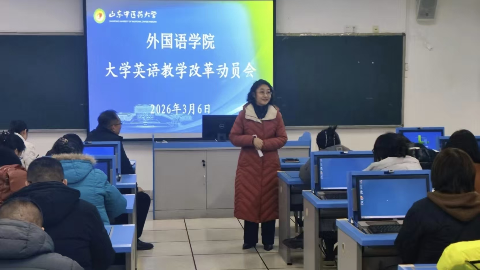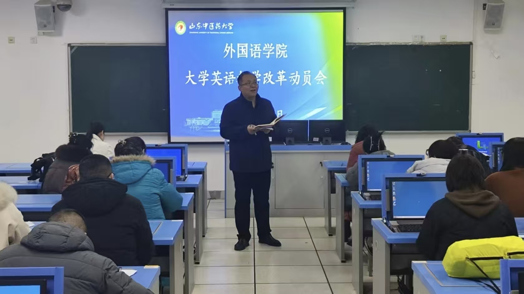 在华佗楼2号语音室召开大学英语教学改革动员会。院长苏娜娜主持会议并讲话,副院长李成华参加会议。