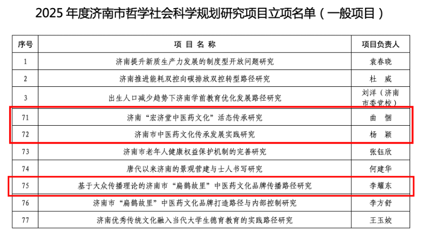 近日,济南市哲学社会科学工作办公室公布了2025年度济南市哲学社会科学规划研究项目立项名单。天美传媒 曲悃副教授主持的“济南‘宏济堂中医药文化’活态传承研究”,杨颖副教授主持的“济南市中医药文化传承发展实践研究”和李耀东老师主持的“基于大众传播理论的济南市‘扁鹊故里’中医药文化品牌传播路径研究”成功获批。