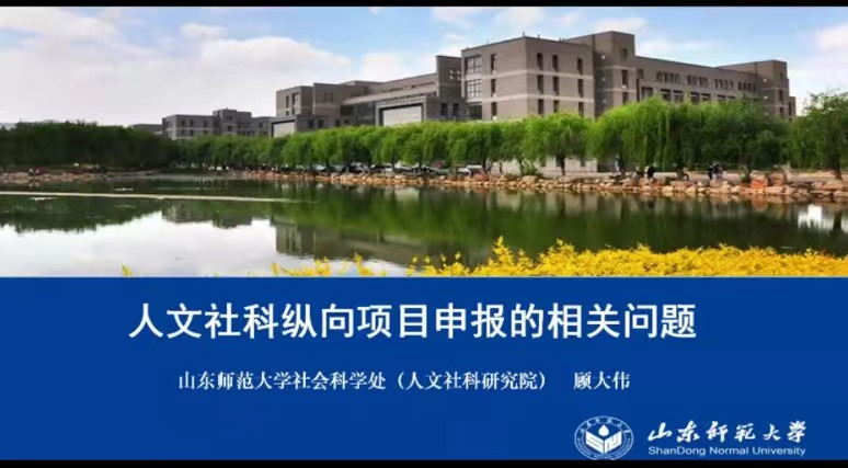 本次专题培训会邀请山东师范大学马克思主义学部党委书记、原社会科学处副处长顾大伟作题为《人文社科纵向项目申报的相关问题》报告。顾大伟从事人文社科研究管理工作近二十年,具有丰富的人文社科纵向项目申报和管理经验。他的报告从项目申报缘起、人文社科纵向项目体系及申报时间、国社科项目申报书填报和管理者视角下的项目申报技巧等四个方面展开。