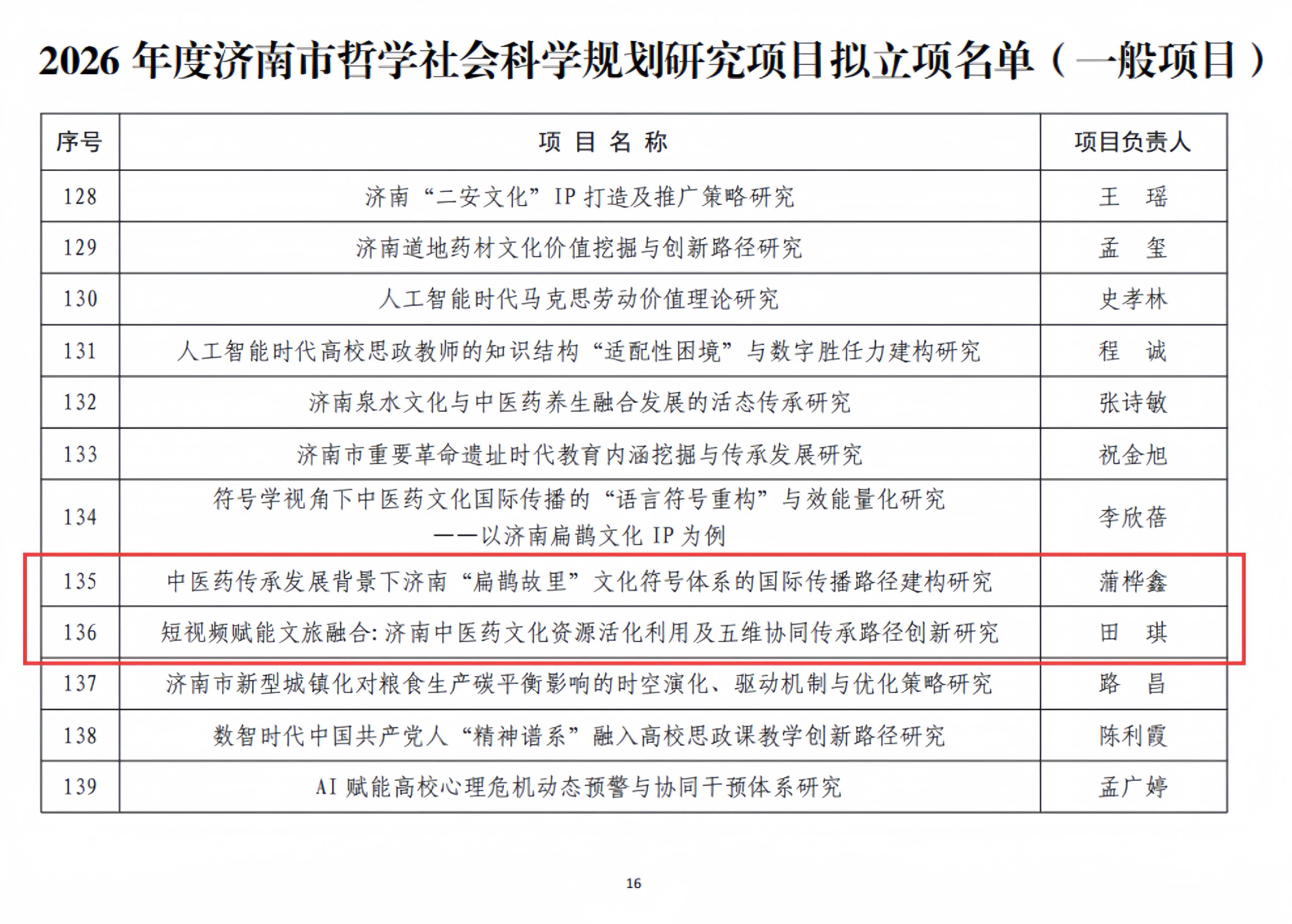 蒲桦鑫申报的《中医药传承发展背景下济南“扁鹊故里”文化符号体系的国际传播路径构建研究》、田琪申报的《短视频赋能文旅融合:济南中医药文化资源活化利用及五维协同传承路径创新研究》两项课题成功获批立项。