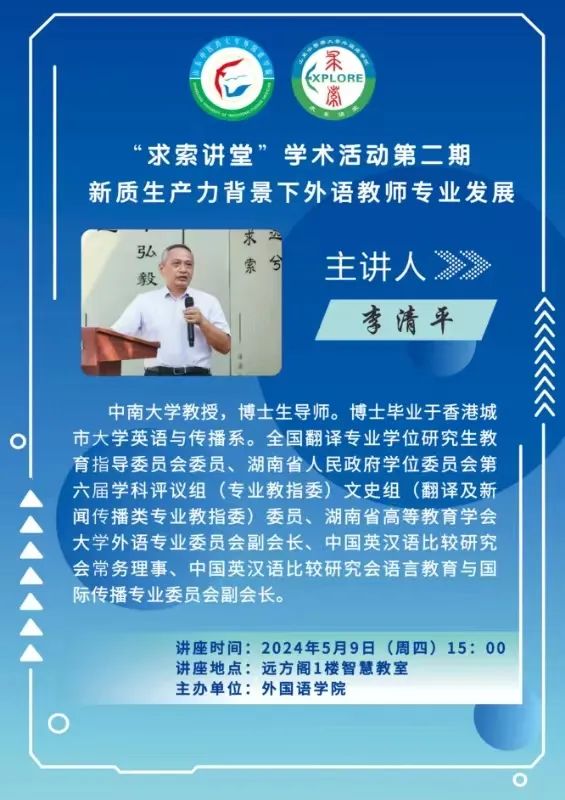 邀请中南大学教授、博士生导师李清平作题为“新质生产力背景下外语教师专业发展”的学术讲座,诚邀全体师生共同参与。