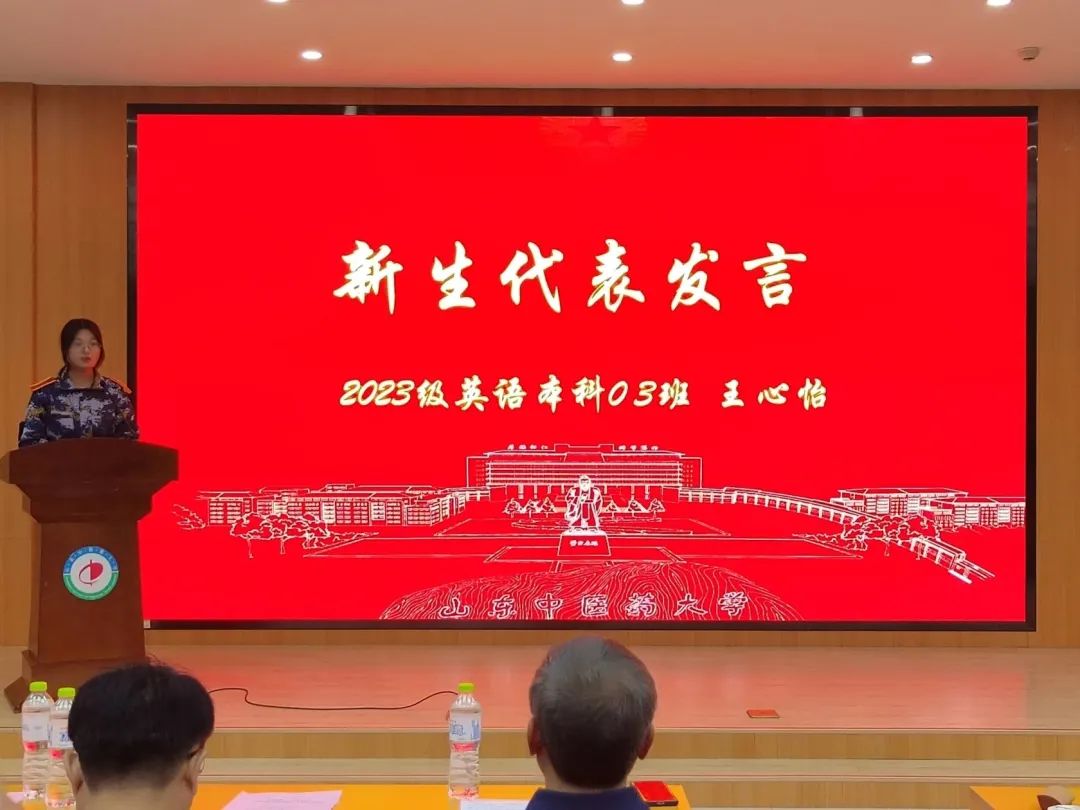 新生代表王心怡同学进行发言,回忆军训时同学们的热血与团结,表达对大学生活的期待与憧憬,简述英语与中医药结合发展的重要性,希望同学们能调整好心态,书写大学新篇章。