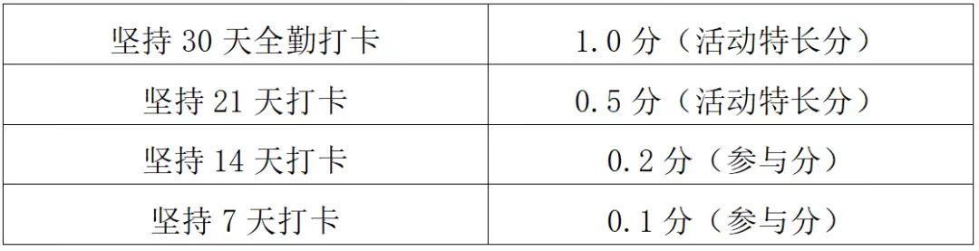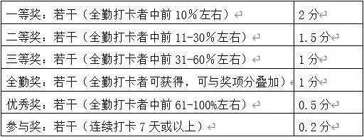 跳绳、跑步两种方式分别评奖。连续打卡 30 天的全勤参赛选手,可获得 1 学分作为奖励,此学分独立计算,可与奖项所得学分叠加。