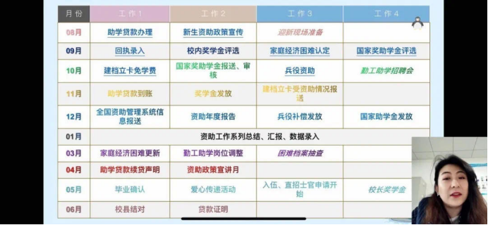 侯老师首先通过资助工作时间线,认真细致地梳理了资助工作包含的具体内容,结合自身工作实际,将新生资助宣传、家庭经济困难认定、国家奖助学金等重点难点工作做了细致讲解。其次,侯老师结合上级部门出台的最新文件,将资助工作方面的一些新规定新政策进行了解读,指导大家在资助工作中严格各项工作制度,规范认定程序,有效开展精准资助工作。