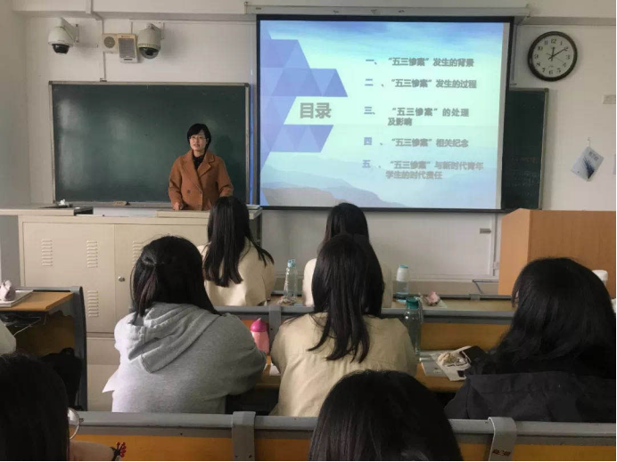 辅导员老师以“五三惨案”与青年学生的时代责任为主题,通过全面客观地讲述在济南发生的“五三惨案”,引导学生缅怀为反抗日本侵略献出生命的革命英雄;通过讲解“五三惨案”的历史启示,使同学们明确新时代青年学生的时代责任。
