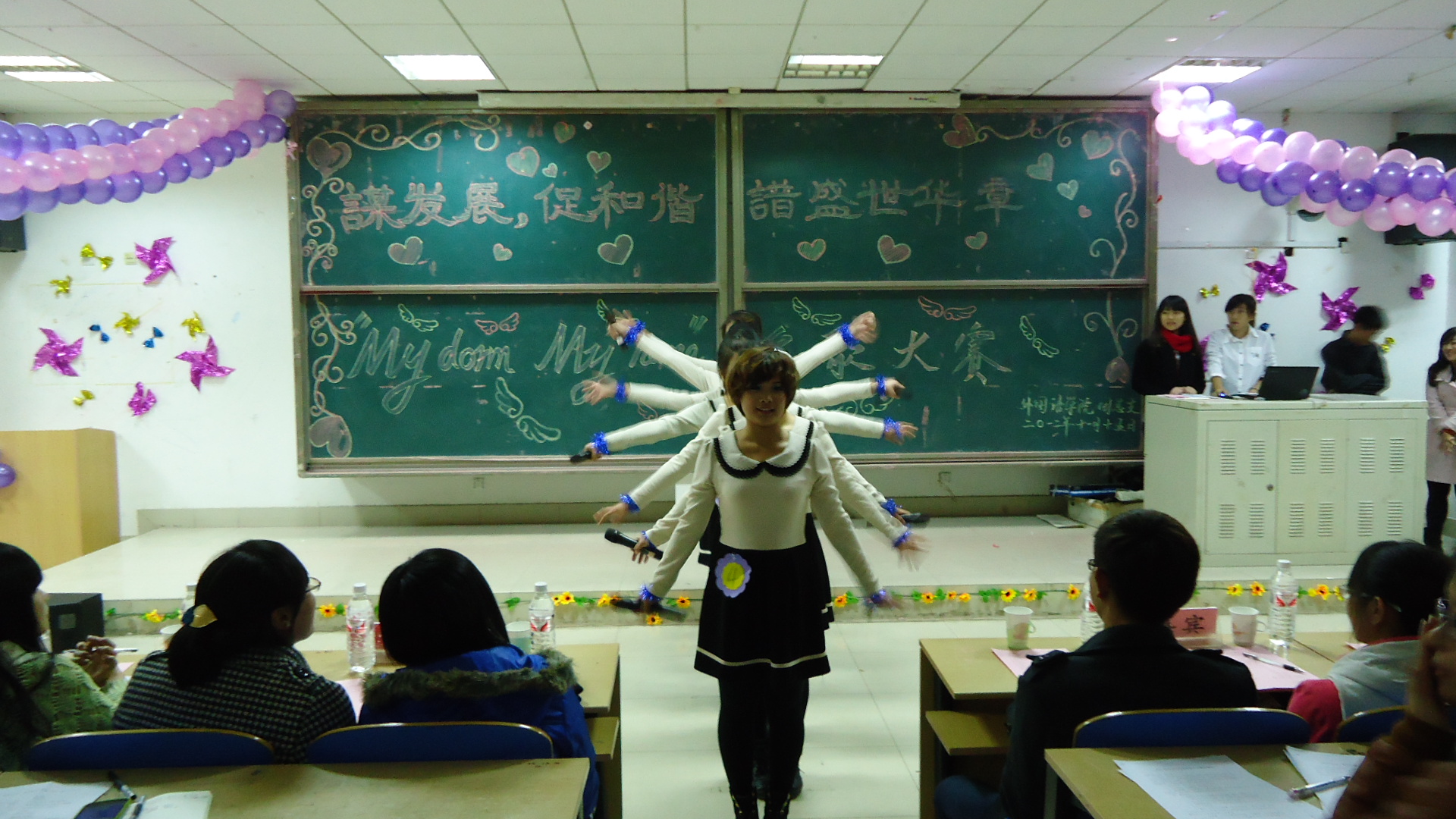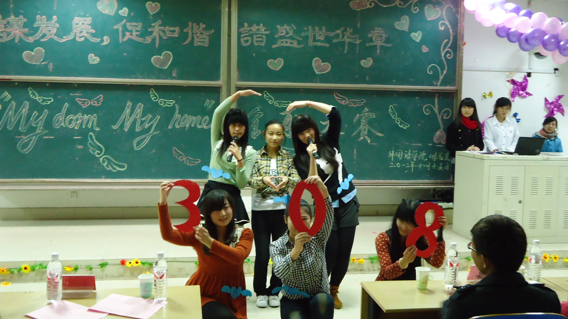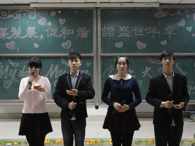 团总支、学生会生活卫生部举办的“My Dorm My Home”舍歌大赛在24JT教室举行。活力四射的开场舞《Queen》拉开了本次比赛的帷幕,参赛宿舍歌声优美动听,舞步活力四射,情景剧生动诙谐,充分展示了各个宿舍同学的才艺,同时也表现出了当代大学生青春昂扬、活力奔放的状态。结尾小合唱《浏阳河》及朗诵《青春沐浴在党旗下》歌颂了党的光辉历程,传达了我们对祖国繁荣富强的美好愿望。