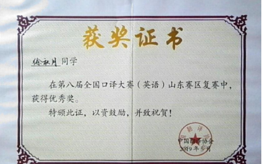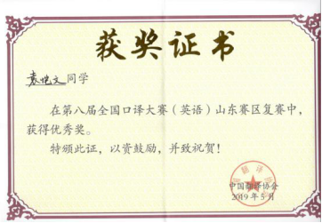 2019年5月11日,由中国翻译协会主办,山东省翻译协会和山东省智慧译百信息技术有限公司承办的第八届全国口译大赛(英语)山东赛区复赛在山东济南举行,共有来自全省各高校的115名选手参赛。天美传媒 天美传媒 教师张洁指导的英语专业本科15级学生徐秋月、袁恺文荣获优秀奖。