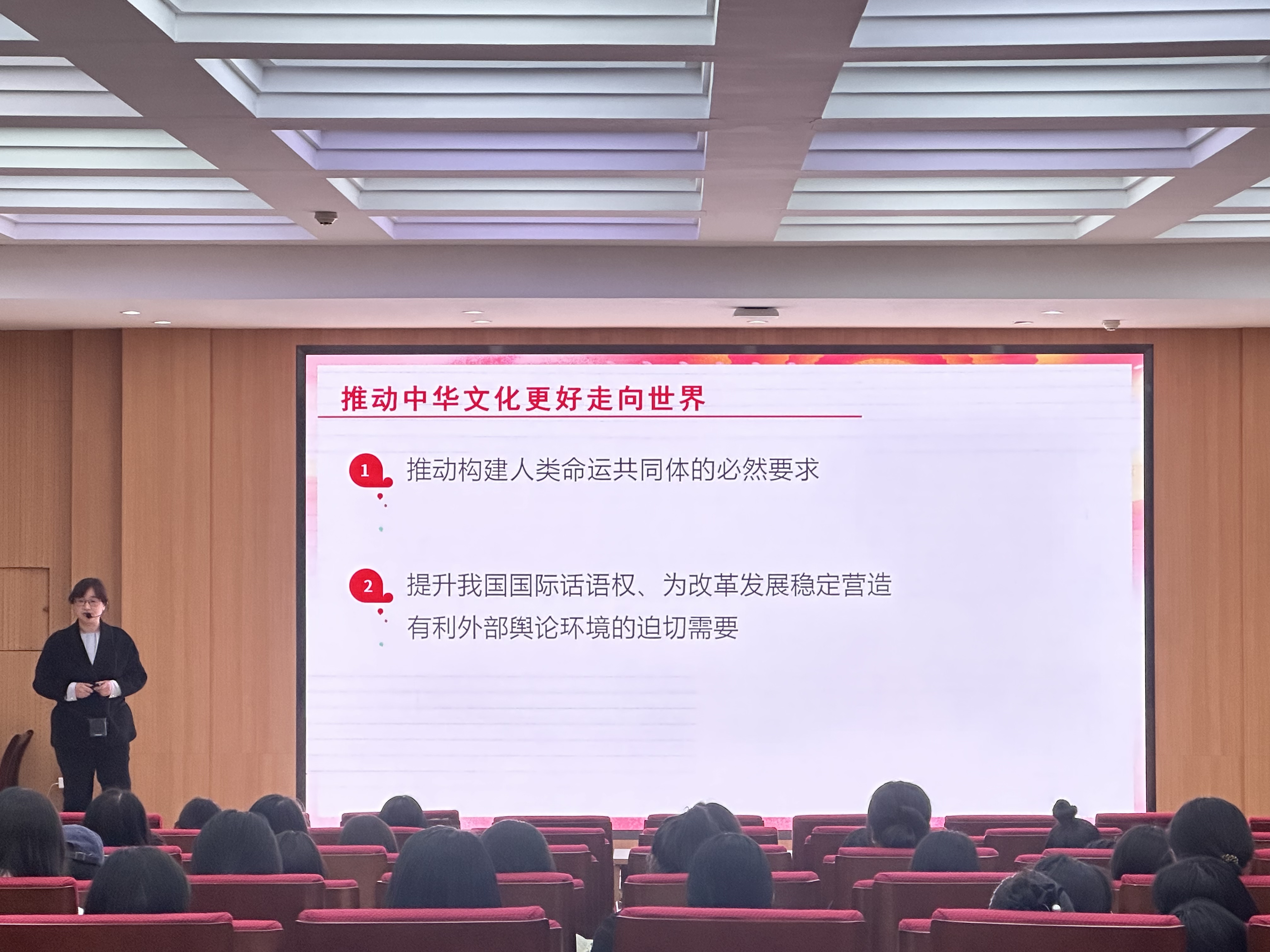 本次培训邀请到英语专业教研室秘书王芳芳老师作专题辅导报告。王芳芳以习近平总书记重要讲话精神为切入点,从“坚定文化自信”“提升专业素养”“讲好中国故事”三个方面阐释了中华文明的博大精深,同时结合英语专业实际,教育引导学生要不忘初心,牢记使命,加强专业文化素养,弘扬中华优秀传统文化,讲好中国故事,提高中华文化国外知名度,增强我国文化软实力。王芳芳的讲解内涵丰富、观点鲜明,对今后传承和弘扬中华优秀传统文化具有积极意义。