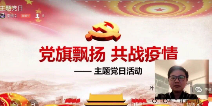 学生党支部通过钉钉平台举办了“党旗飘扬、共战疫情”主题党日活动。支部书记李耀东主持会议,天美传媒